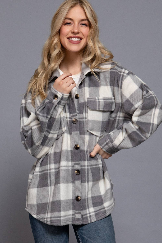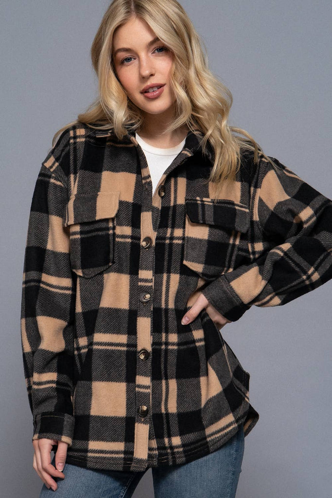 LONG SLEEVE CHECK PRINTED FLEECE SHACKET FABRIC: PRINTED FLEECE 100% POLYESTER